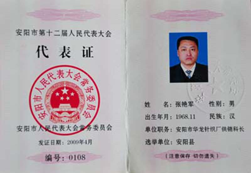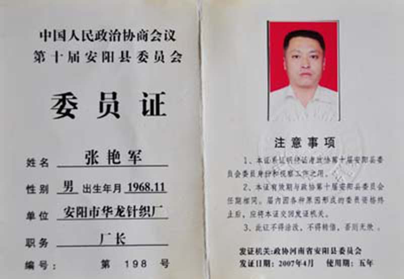 中國人民政治協(xié)商會議第十屆安陽縣委員會委員證